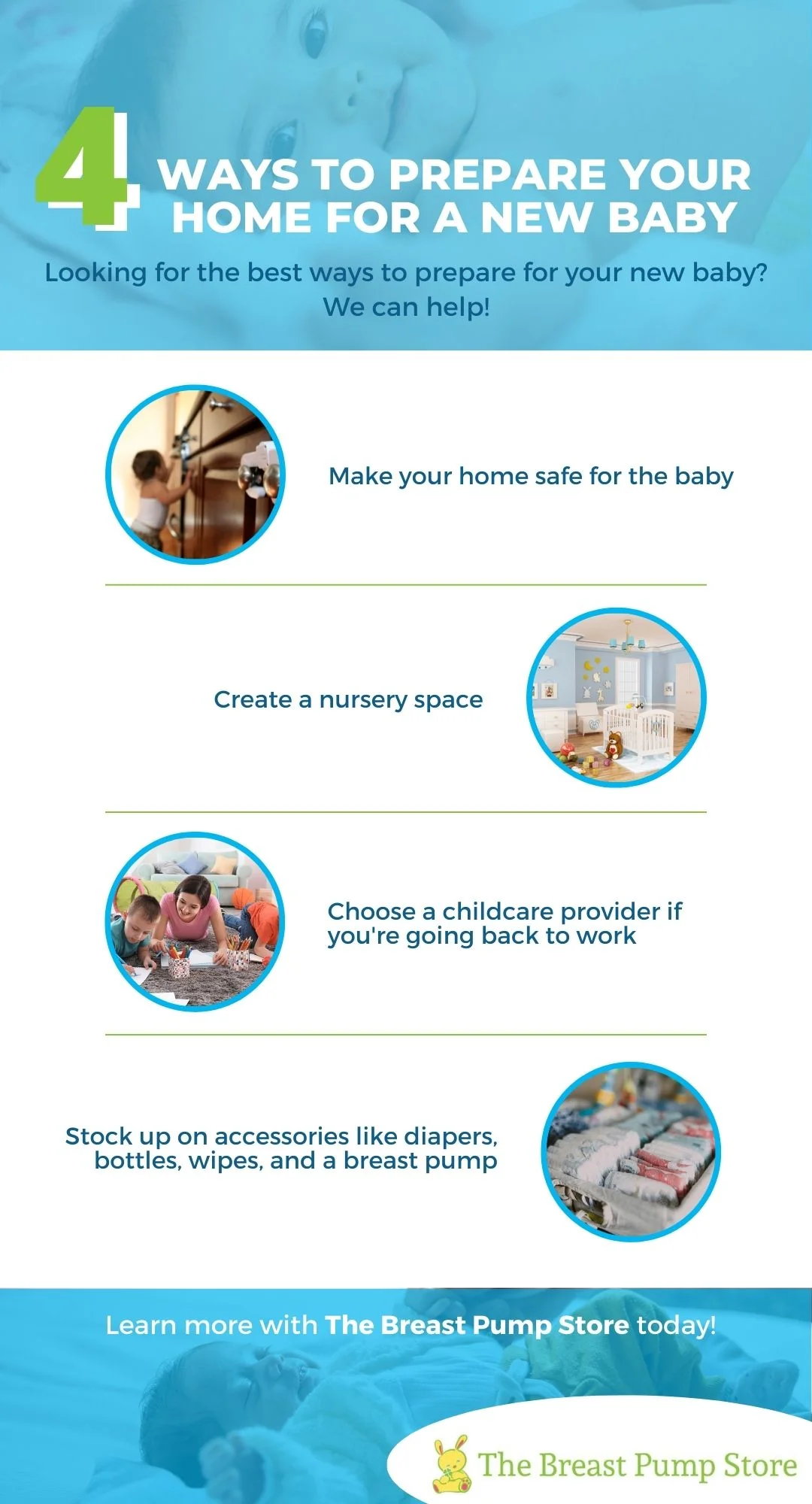 If you’re expecting a new addition to your family, congratulations! You’re in for one of the most rewarding experiences of your life. One of the first things you’ll want to do is prepare your home for the new arrival. At The Breast Pump Store, we know that things might be a bit crazy in your home right now, so we are here to help you get prepared! Continue reading to learn four of our tips for preparing for your child.